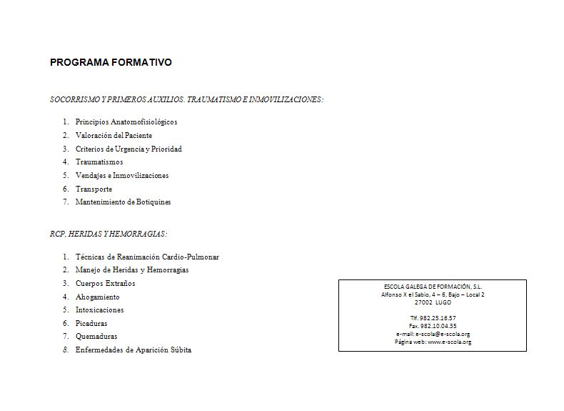 Al finalizar el curso el alumno tendrá que saber como actuar ante un caso de primeros auxilios. Conocer las maniobras encaminadas a revertir una Parada Cardio-Pulmonar. Y, por último, saber como actuar ante heridas, intoxicaciones, picaduras, quemaduras y convulsiones.